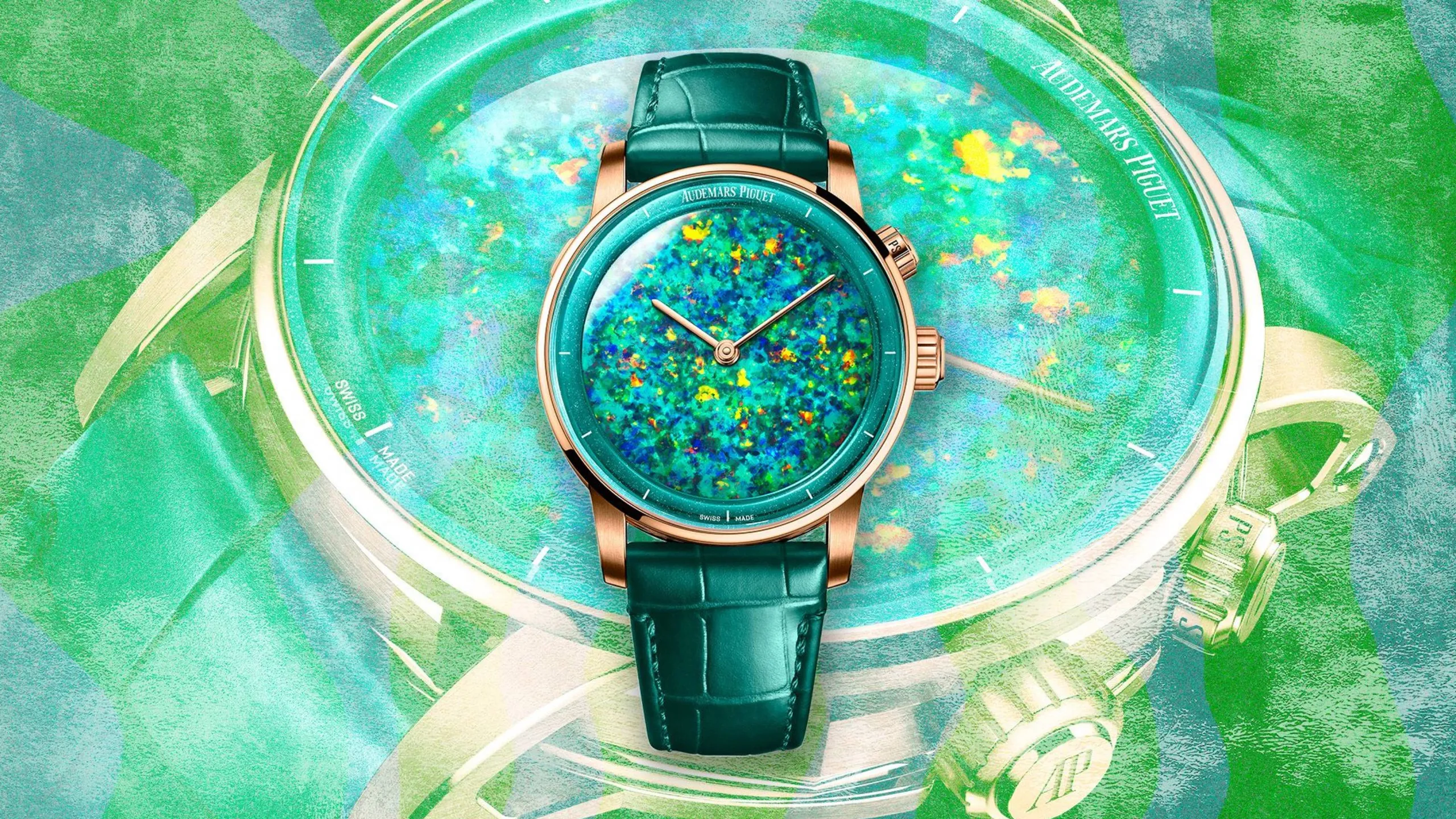 Con un diámetro total de 29.9 mm y un grosor de 5.9 mm, este reloj está adornado con un precioso marco de ópalo natural. En total, 53 piedras, cada una con una estructura interna tridimensional única, reflejan y difractan la luz de manera singular. Este modelo de AP también es resistente al agua hasta 20 metros.