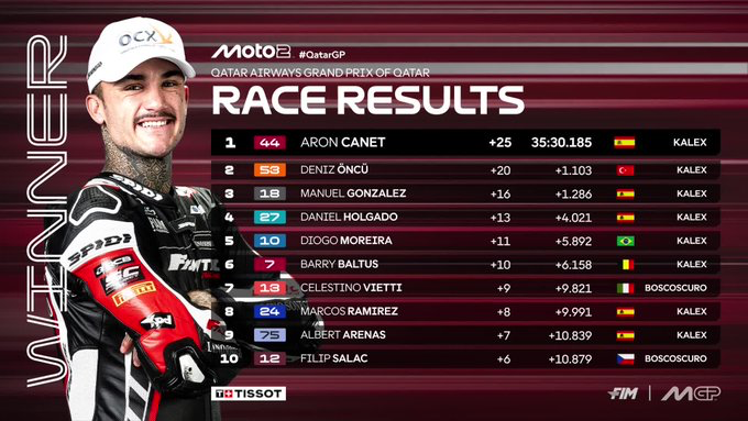 Arón Canet (Kalex) logró su primera victoria de la temporada, que le otorga el liderato en el Mundial, al ganar este domingo el Gran Premio de Qatar de Moto2 en el circuito de Lusail.