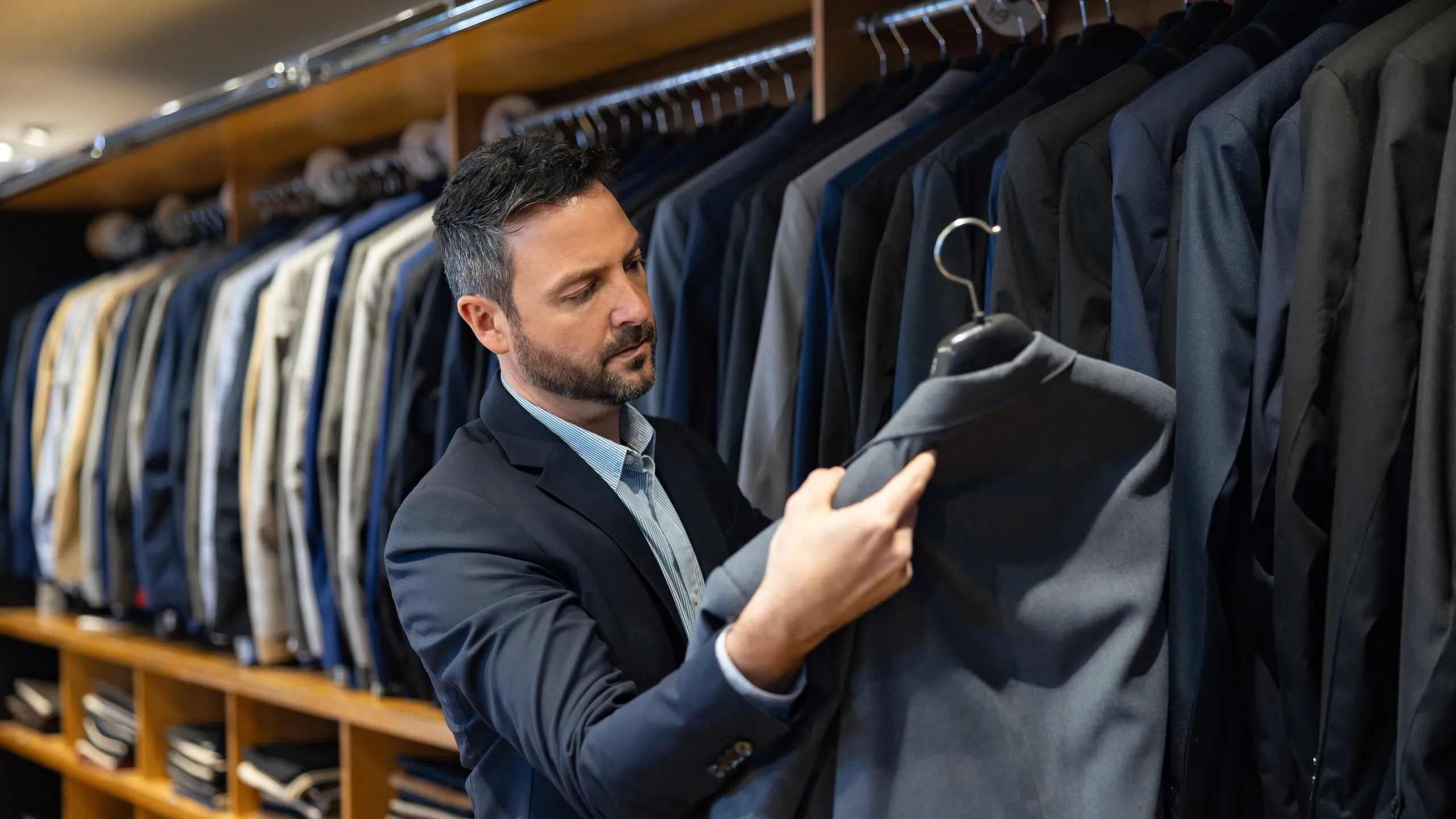 Si eres de los que prefiere las compras en línea y evade a toda costa los centros comerciales, tenemos una mala noticia: deberás asistir al mayor número posible de tiendas. Y es que la clave para encontrar el traje perfecto es identificar qué luce mejor en tu cuerpo, por lo que nuestro consejo es probar con modelos varios, lo que incluye diferentes tipos de solapa, largo de la chaqueta, número de botones o caída del pantalón.
