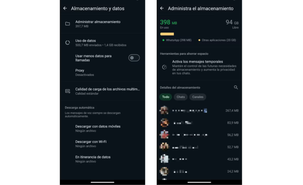En Administrar el almacenamiento, los usuarios ven que chat ocupa más memoria. (WhatsApp)