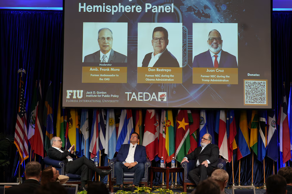 Antes de la mesa sobre economía, habló el almirante Alvin Hosley, jefe del Comando Sur, y tres expertos en política exterior estadounidense: el embajador Frank Mora, exrepresentante de Washington ante la OEA; Dan Restrepo, exasesor del Consejo de Seguridad Nacional durante el gobierno de Barack Obama; y Juan Cruz, quien ocupó el mismo cargo en el primer Gobierno de Trump.