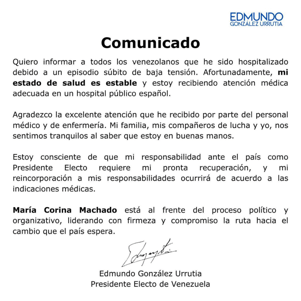 Edmundo González, principal opositor a Nicolás Maduro, ha sido hospitalizado este lunes en Madrid tras “un episodio súbito de baja tensión“, según informó en un comunicado en su cuenta de X.