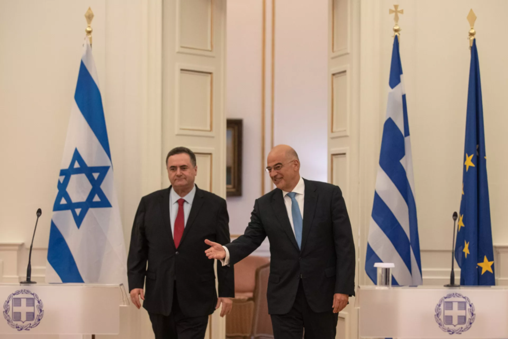 El ministro de Asuntos Exteriores griego, Nikos Dendias, a la derecha, muestra el camino a su homólogo israelí, Israel Katz, a su llegada a una rueda de prensa.AP