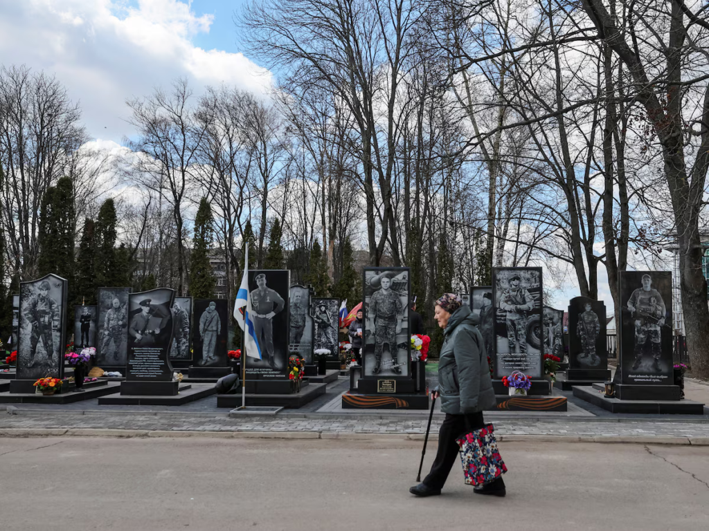 Una mujer camina por un cementerio junto a las tumbas de los miembros del servicio ruso que murieron en el transcurso del conflicto entre Rusia y Ucrania en un monumento conmemorativo de la Segunda Guerra Mundial en la ciudad de Kursk, Rusia, el 20 de marzo de 2025 (REUTERS/Shamil Zhumatov)