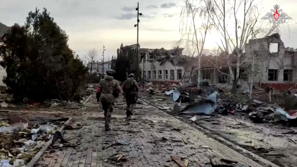 Militares rusos caminan junto a un edificio destruido en la ciudad de Sudzha, recientemente recuperada por las fuerzas armadas rusas durante el conflicto ruso-ucraniano en la región de Kursk, Rusia. Esta imagen es parte de un video publicado el 15 de marzo de 2025 (REUTERS)