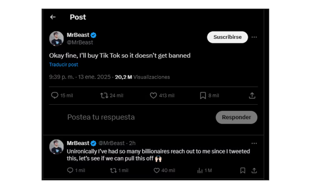 Jimmy Donaldson, conocido como MrBeast en redes sociales como YouTube, ha manifestado interés en adquirir TikTok para evitar su prohibición en Estados Unidos. A través de sus redes sociales, expresó su intención de comprar la plataforma y afirmó haber mantenido conversaciones con varios multimillonarios para formular una oferta formal.