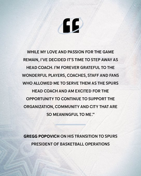 Esta retirada supone un adiós al que es el entrenador con más victorias de la historia de la NBA. Tras casi 30 años siendo el técnico de San Antonio, ostentaba el cargo desde diciembre del 1996, Popovich ganó un total 1.422 partidos y llevó a la franquicia tejana a cinco anillos de campeón, en 1999, 2003, 2005, 2007 y 2014.