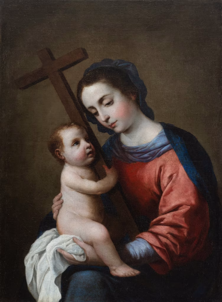 According to specialists involved in its study, the painting belongs to Zurbarán’s Madrid period, a phase marked by a softening of contrasts, a greater atmospheric depth and a more courtly sensibility. The Virgin’s face is modelled with a subtle transition of light that differs notably from the sharper tenebrism of the Seville years. The blue mantle, enriched with pigments that suggest the use of expensive materials, anchors the composition with a chromatic intensity associated with works created for demanding patrons. The Christ Child, holding a cross that anticipates Passion imagery, introduces a quiet theology that combines tenderness with premonition, a line of thought characteristic of the painter’s more mature works.
