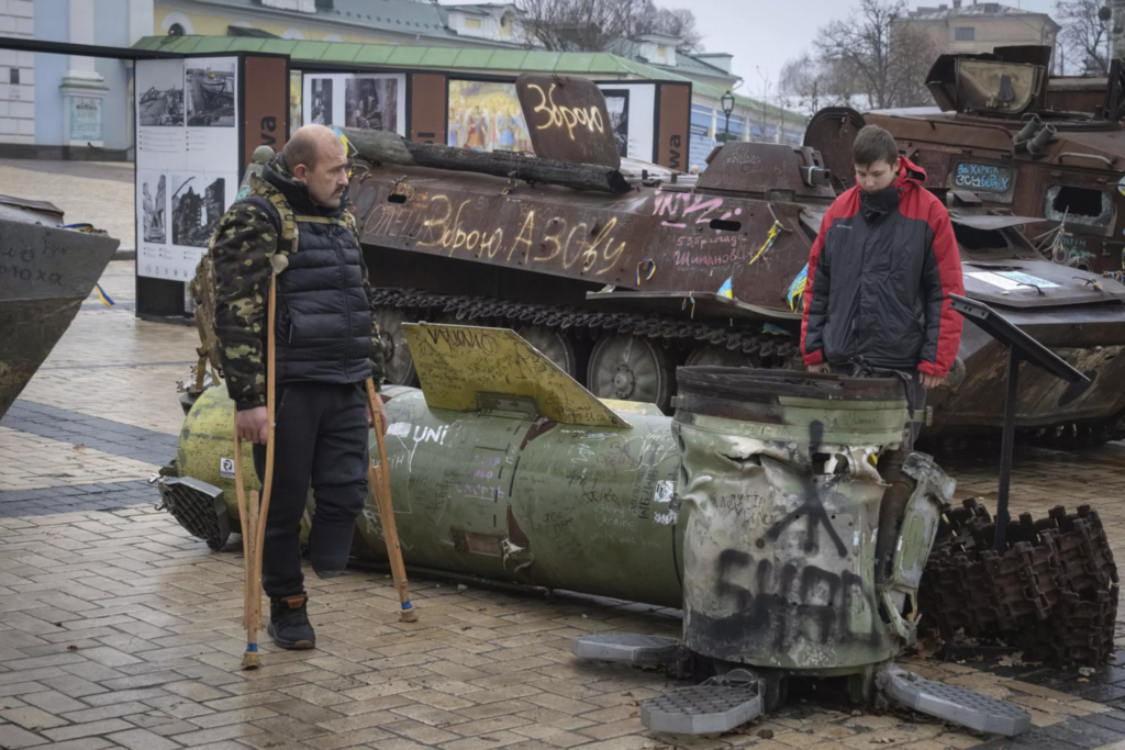 ARCHIVO: Un veterano de guerra, que perdió una pierna en la guerra entre Rusia y Ucrania, y su hijo miran fragmentos del cohete ruso en una exposición en el centro de Kiev, UcAP Photo