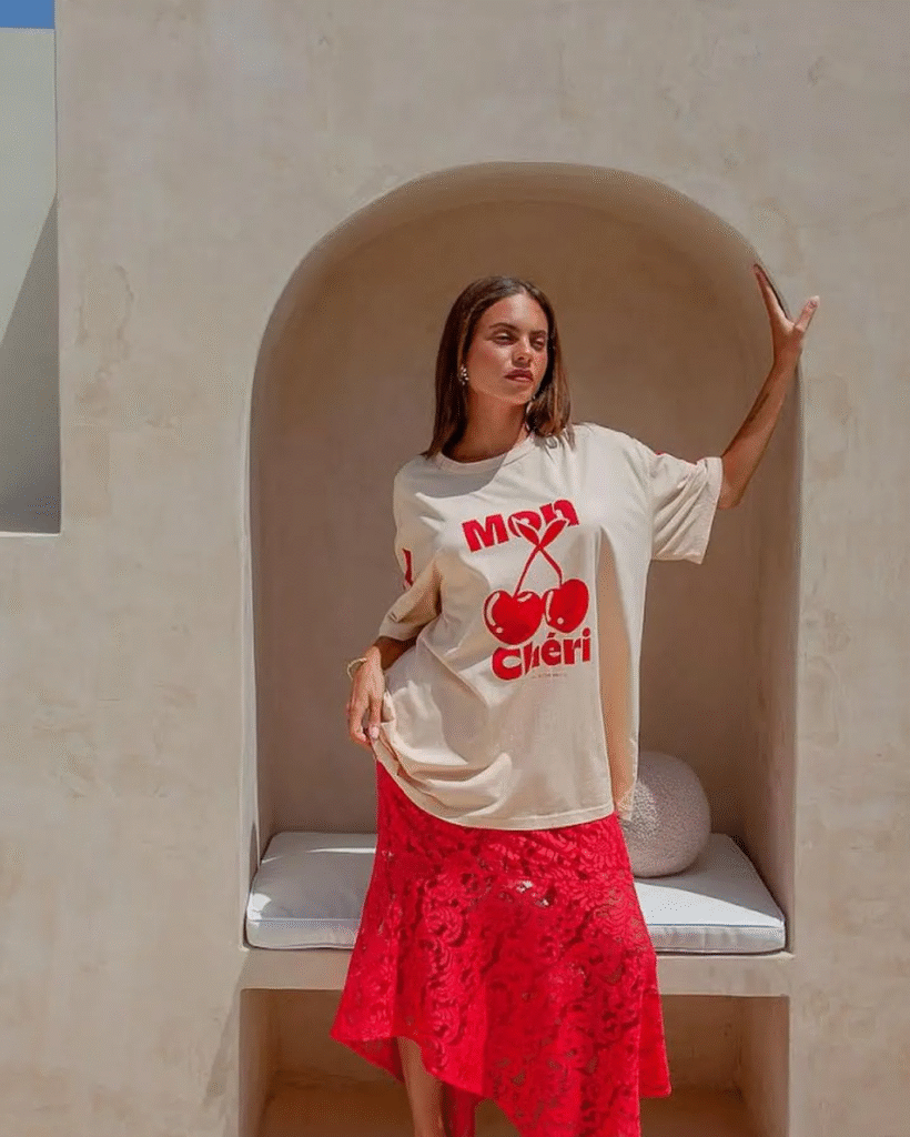 La nostalgia en una camiseta no se limita al recuerdo; puede convertirse en performance. En pasarelas como las de Maison Margiela, las playeras gráficas incorporan un choque de códigos: texturas delicadas, cortes asimétricos y tipografías conceptuales que cuestionan el significado del mensaje impreso. Este tratamiento transforma lo cotidiano en pieza artística.