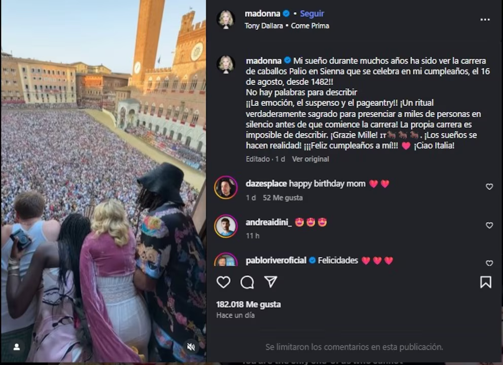 El Palio fue el telón de fondo, pero el mensaje fue claro: Madonna continúa escribiendo su propia liturgia. Una liturgia donde cada cumpleaños se convierte en performance, cada gesto en símbolo, cada año en oportunidad para reinventar lo sagrado a través del arte y la cultura pop.