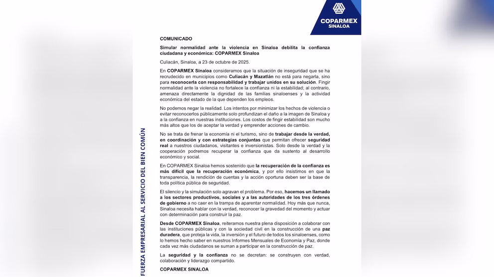 La Confederación Patronal de la República Mexicana (Coparmex) lanzó una alerta pública sobre el deterioro económico y social que ha provocado la guerra interna del Cártel de Sinaloa, advirtiendo que la simulación de normalidad por parte de las autoridades está debilitando la confianza y fracturando la estabilidad productiva del estado.