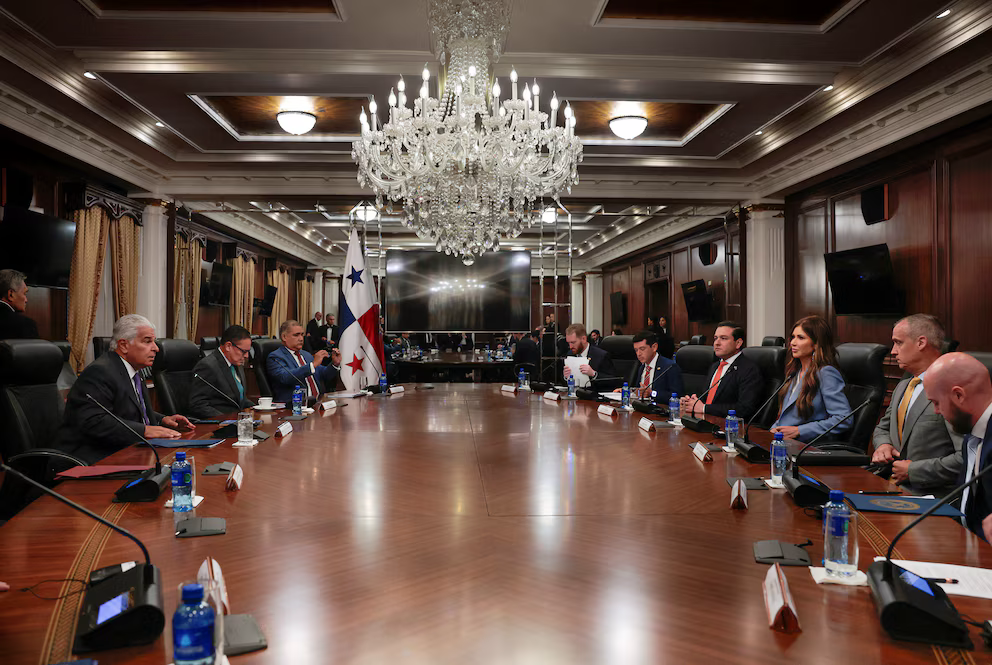 La secretaria de Seguridad Nacional de Estados Unidos, Kristi Noem, y el presidente de Panamá, José Raúl Mulino, se reunieron en el Palacio de las Garzas, en la ciudad de Panamá el 24 de junio de 2025 (Anna Moneymaker/REUTERS)